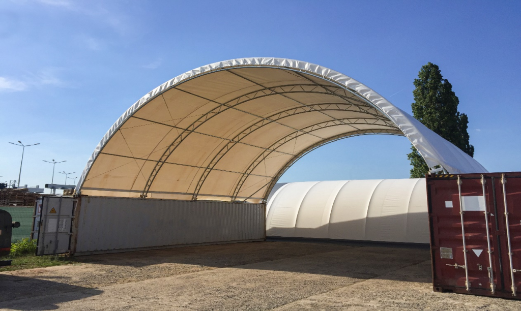 A ponyvacsarnok tartó szerkezete a két konténer között elhelyezett fix, rácsos tartókból vagy egyszerű, rozsdamentes acélból és összekötőkből áll. Ezek a típusú sátrak telepíthetőek hajózási konténerre, betonfalakra, irodai konténerekre, vas-szerkezetre vagy akár talajra is rögzíthetők.